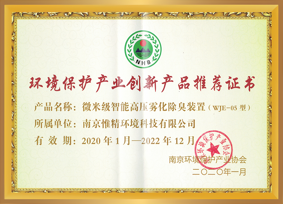 環境保護產業創新產品推薦證書(微米級智能高壓霧化除臭裝置WJE-05型)2020年1月-2022年12月